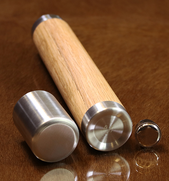 Elegant Flask. Completely handmade from top to bottom. Designed to carry your drink on the go. Beautifully crafted in wood and stainless steel in a cylindrical form. Made to last a lifetime, timelessly elegant.