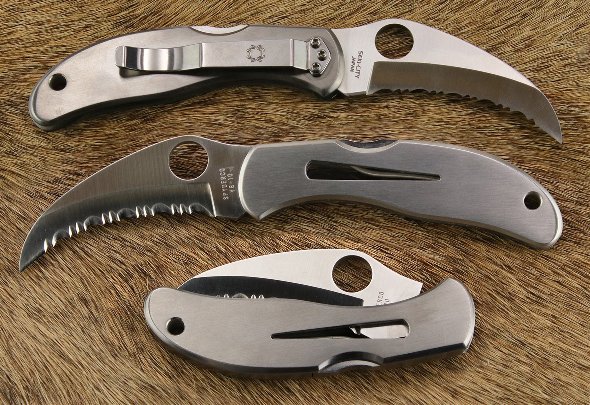 Like an animal’s claw, hawkbill blades pierce with the point and draw the material being cut into the natural curve of the edge. The impressive mechanics of this cutting action are even more potent when amplified by a serrated edge. The Spyderco Harpy was the first knife to integrate the dynamics of the hawkbill blade profile with the voracious cutting power of our fully serrated SpyderEdge. Its hollow-ground VG-10 stainless steel blade cuts with an authority far beyond its size and makes it the tool of choice for cutting netting, rope, cord, and webbing. Its Trademark Round Hole™ allows quick, positive, one-handed opening with either hand and proudly proclaims its Spyderco pedigree. Capable of right or left-side tip-up or tip-down carry, the Harpy features solid stainless steel handle construction, a sturdy back lock mechanism, and a drying vent/shackle key.